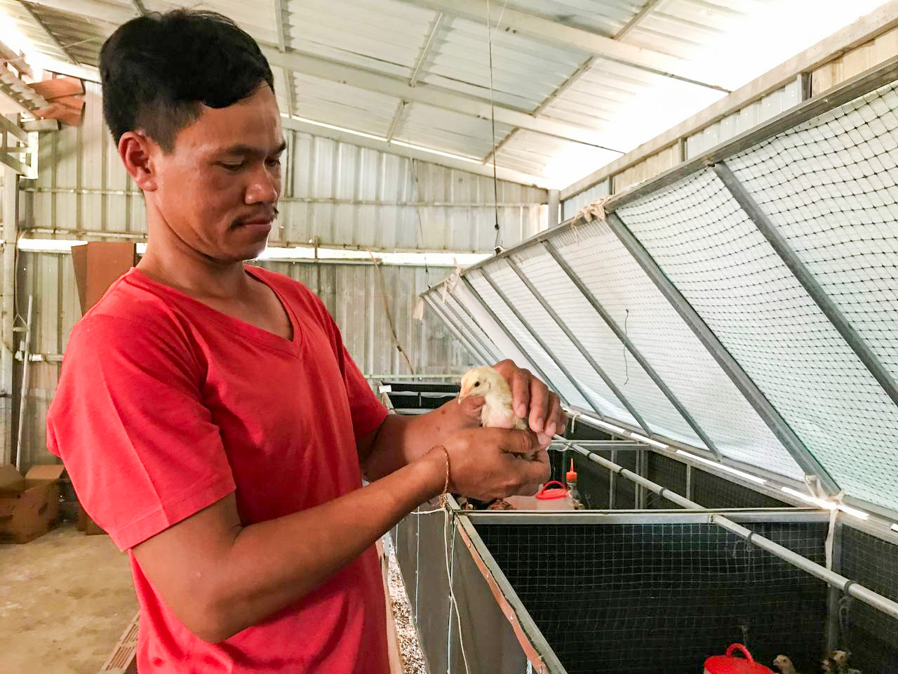 Mr. Chin Bonat, a chicken producer and member of the Kantrang Balang Raksmey Satrey Samaky Agricultural Cooperative, resides in Siem Reap Province with his wife and daughter. Previously a smallholder farmer cultivating rice and vegetables, Mr. Bonat also raised chickens primarily for family consumption. However, due to limited knowledge of chicken breeding techniques, he struggled to sell his chickens in the market, resulting in an annual income as low as $100. He lacked understanding in areas such as vaccination, chicken feed formulation, biosecurity measures, and accessing community agro-vet entrepreneur services.